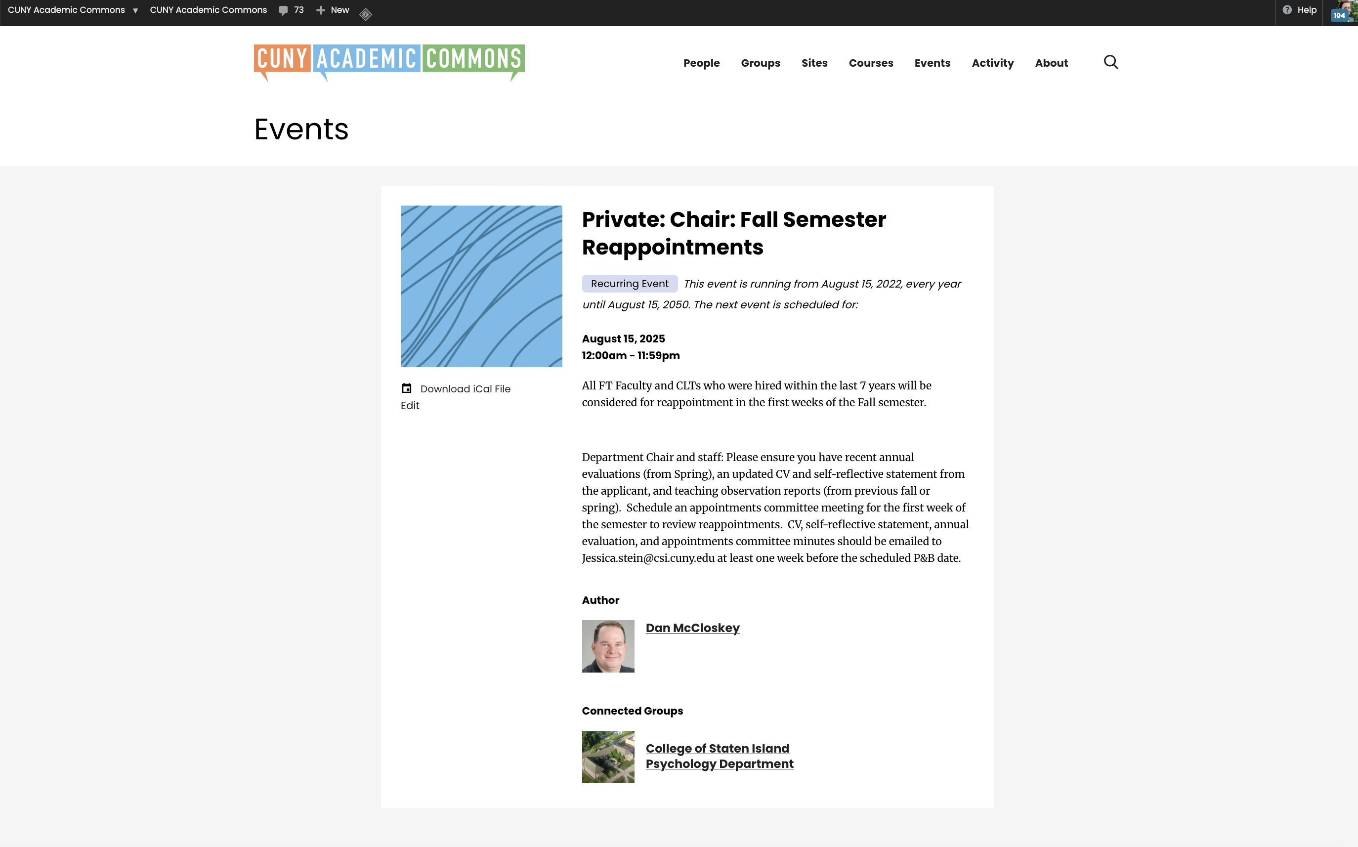 For example the event "Chair: Fall Semester Reappointments" is visible but when I click on it, it notes that the event is private, and it is connected to a private group. See screenshots.
