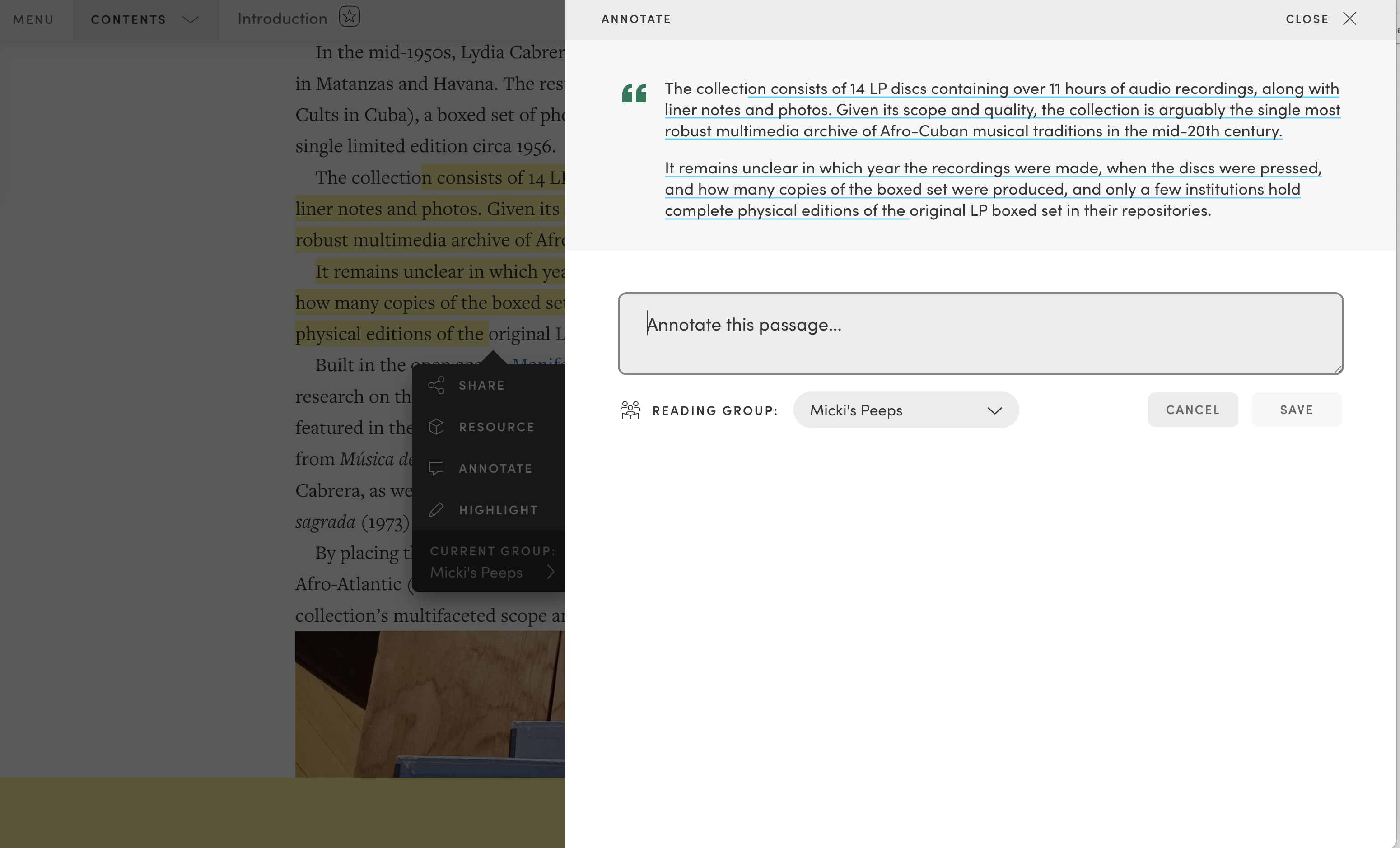 Thank you, Sara! This is looking great. One thought that I have -- and I don't know whether others will share it or agree -- is that with the modal open, it's a little hard to differentiate the modal space from the rest of the items on the screen. I wanted to see how we handled that on Manifold, and it looks like we darken other parts of the screen/background when the modal is open there. I'm not sure whether that is possible/feasible for us on the Commons, but I've attached screenshots for you to consider.