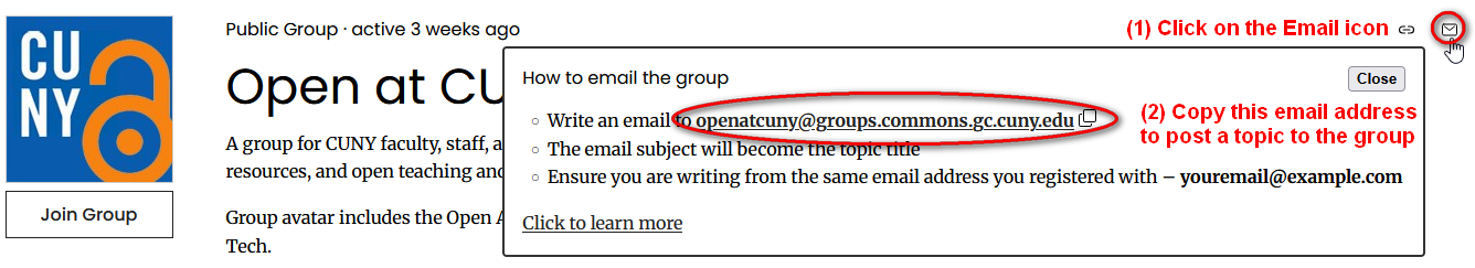 You can even post a new topic via email. Make sure you send from the email address shown in your Commons settings and use the group’s quick link appended by “@groups.commons.gc.cuny.edu.” For example, if the group’s quick link is cuny.is/omeka, post your topic to: “cuny.is/omeka@groups.commons.gc.cuny.edu”.