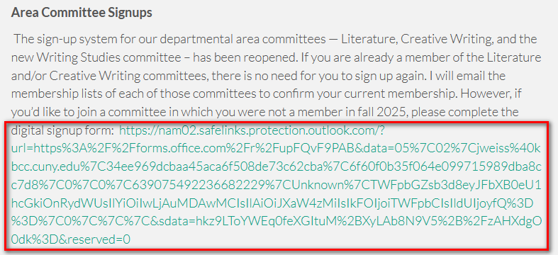 For this specific instance, in the blog post -- https://kccenglishonline.commons.gc.cuny.edu/janes-kcc-english-department-news-22/ -- there is a link under the "Area Committee Signups" section that uses the entire https://nam02.safelinks.protection.outlook.com/... URL as the link text (see attached screenshot). Since the group email uses the blog post's content and due to the small width of the email template, that is why the email does not look as it should. In this example, if that long link text was replaced with a shorter version of the URL or even using a phrase like "please complete the digital form at this link" instead, the email would look correct.